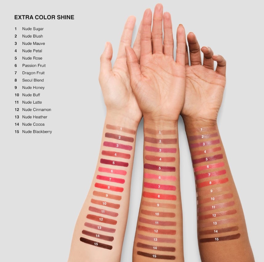Extra Colour Shine Lipstick Ingredients: Ingredients: Bis-Diglyceryl Polyacyladipate-2, Diisostearyl Malate, Polyglyceryl-2 Triisostearate, Bis-Behenyl/Isostearyl/Phytosteryl Dimer Dilinoleyl Dimer Dilinoleate, Caprylic/Capric Triglyceride, Microcrystalline Wax\Cera Microcristallina\Cire Microcristalline, Synthetic Wax, Dimer Dilinoleyl Dimer Dilinoleate, Simmondsia Chinensis (Jojoba) Seed Oil, Safflower Oil/Palm Oil Aminopropanediol Esters, Paraffin, Stearalkonium Hectorite, Propylene Carbonate, Ethylene/Propylene Copolymer, Fragrance (Parfum), Limonene, Linalool, Citral, Phenoxyethanol, [+/- Titanium Dioxide (Ci 77891), Iron Oxides (Ci 77491), Iron Oxides (Ci 77492), Iron Oxides (Ci 77499), Blue 1 Lake (Ci 42090), Red 6 (Ci 15850), Red 7 (Ci 15850), Red 28 Lake (Ci 45410), Red 33 Lake (Ci 17200), Yellow 5 Lake (Ci 19140), Yellow 6 Lake (Ci 15985)]