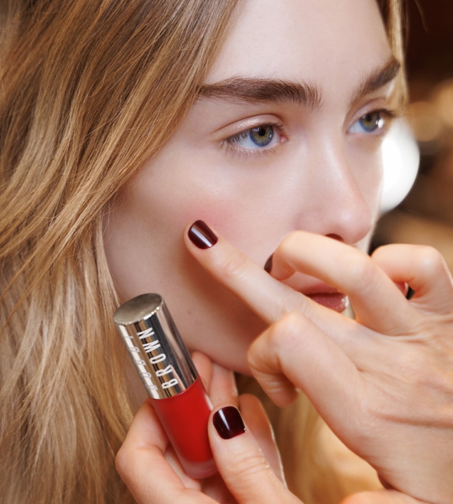 Dot Lip & Cheek Oil in Heat onto cheek and blend, patting any excess into lips.