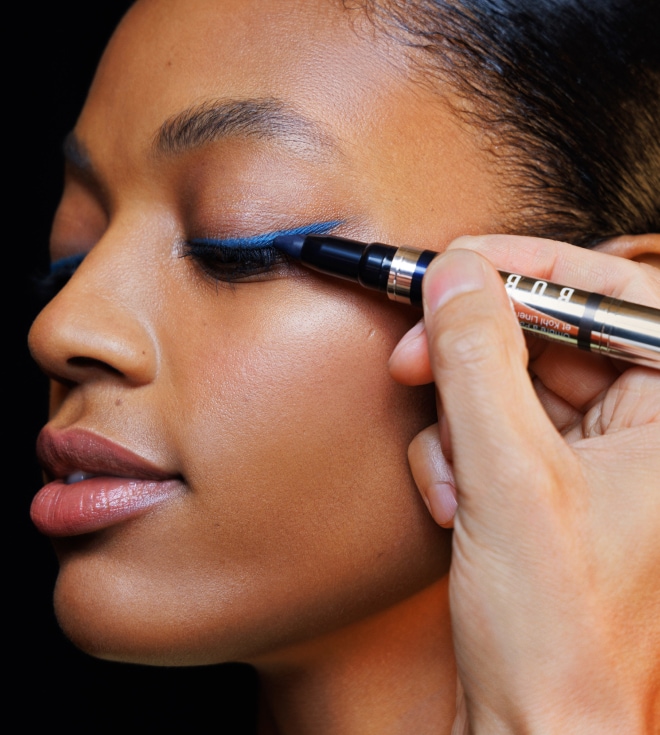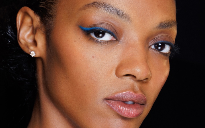 with blue eyeliner, fresh skin, and a nude lip.